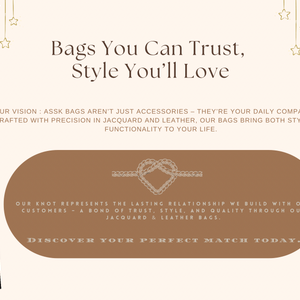 Every stitch and pattern is meticulously crafted to create a piece that not only embodies timeless elegance but also reflects the dedication of skilled artisans. These bags are more than just accessories; they are a fusion of art and utility, designed to complement your style and make a lasting impression. Each one tells a story of artistry and attention to detail, making them a symbol of quality and sophistication. Elevate your fashion statement with our jacquard bags, where passion and precision meet in perfect harmony.